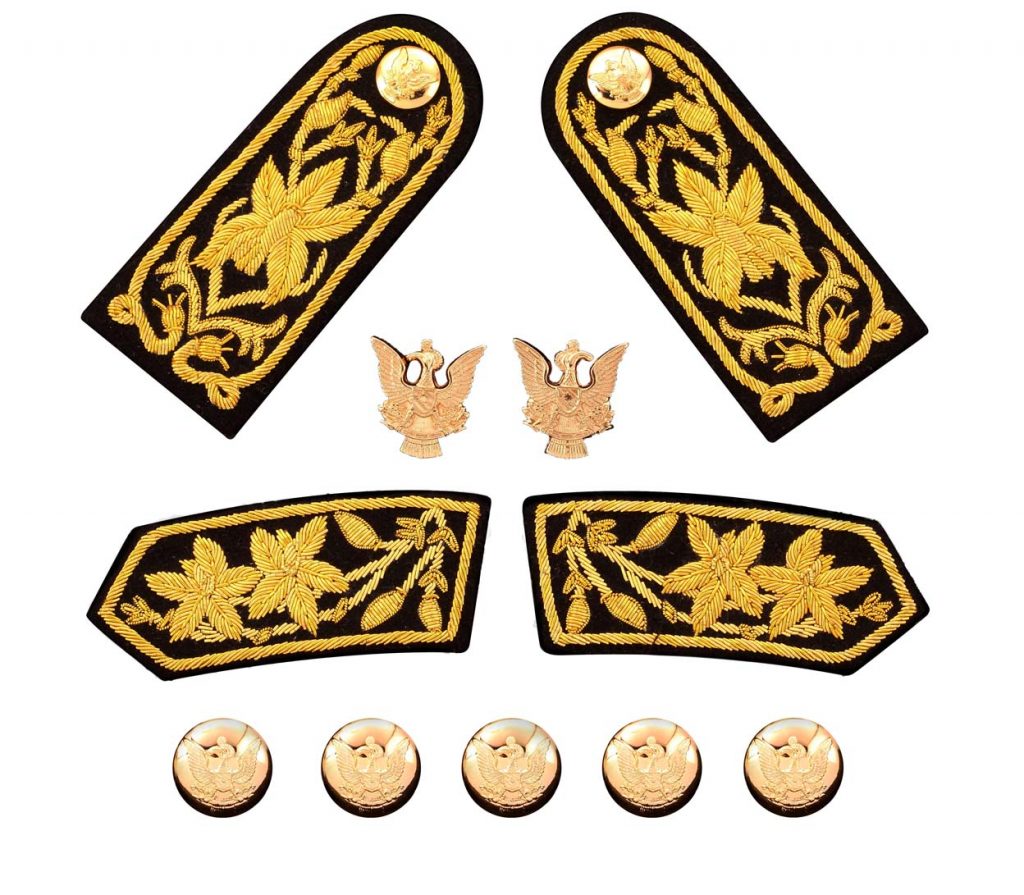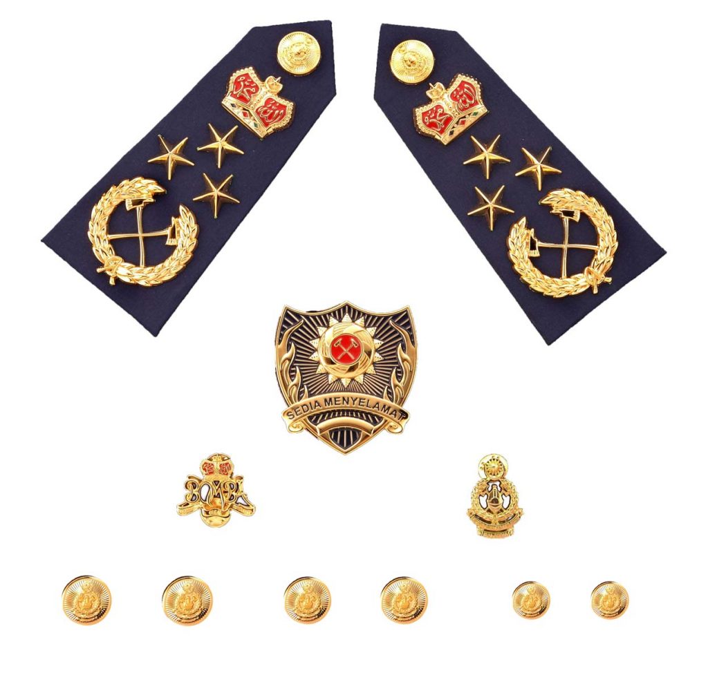 Below is a display of 24K Gold plated suite of qualification badges, regimental badges, regimental buttons, regimental belt buckle, and elegantly embroidered rank shoulder pieces as well as finely crafted uniform buttons.
